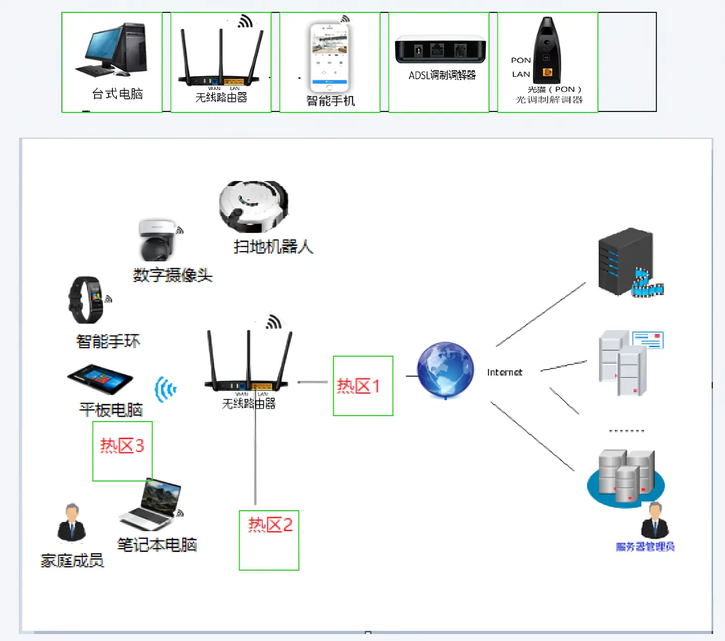 小明家配备了不同类型的信息技术设备,这些设备连接形成家庭局域网并通过光纤接入互联网,从而确保其相关的信息系统正常运行,请你仔细阅读网络连接结构图,补充完善。